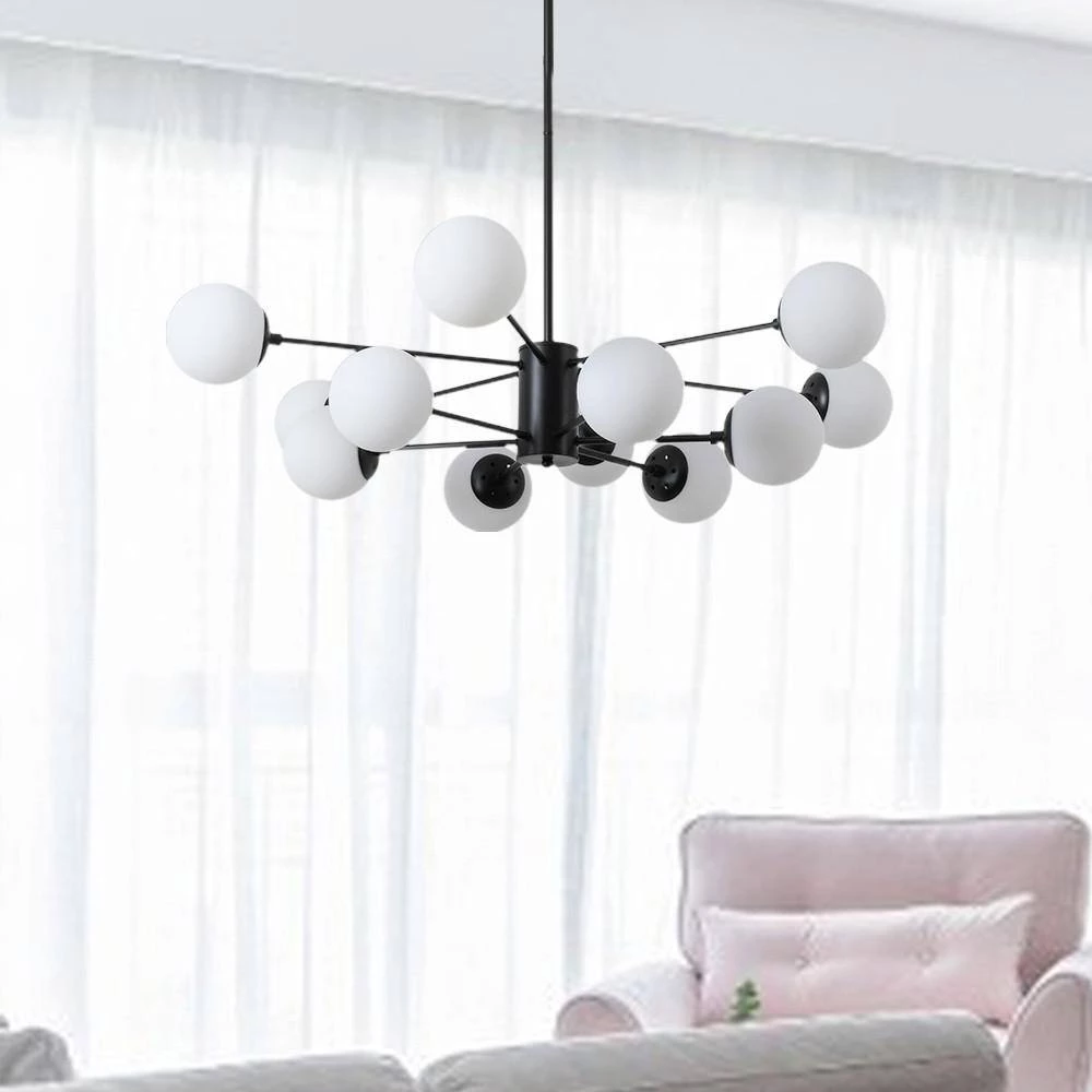This stunning 12-Light Chandelier is perfect for a bedroom. Living room or entryway by providing ideal illumination to your home. The black wrought iron finish and the cream white light bulbs highlights the sputnik design and adds a vintage look and a playful taste to your room, contributes a designer look to you living space and complements all your home settings. The perfect blending of metal and glass gives it a durable quality, makes it possible of long-time use.