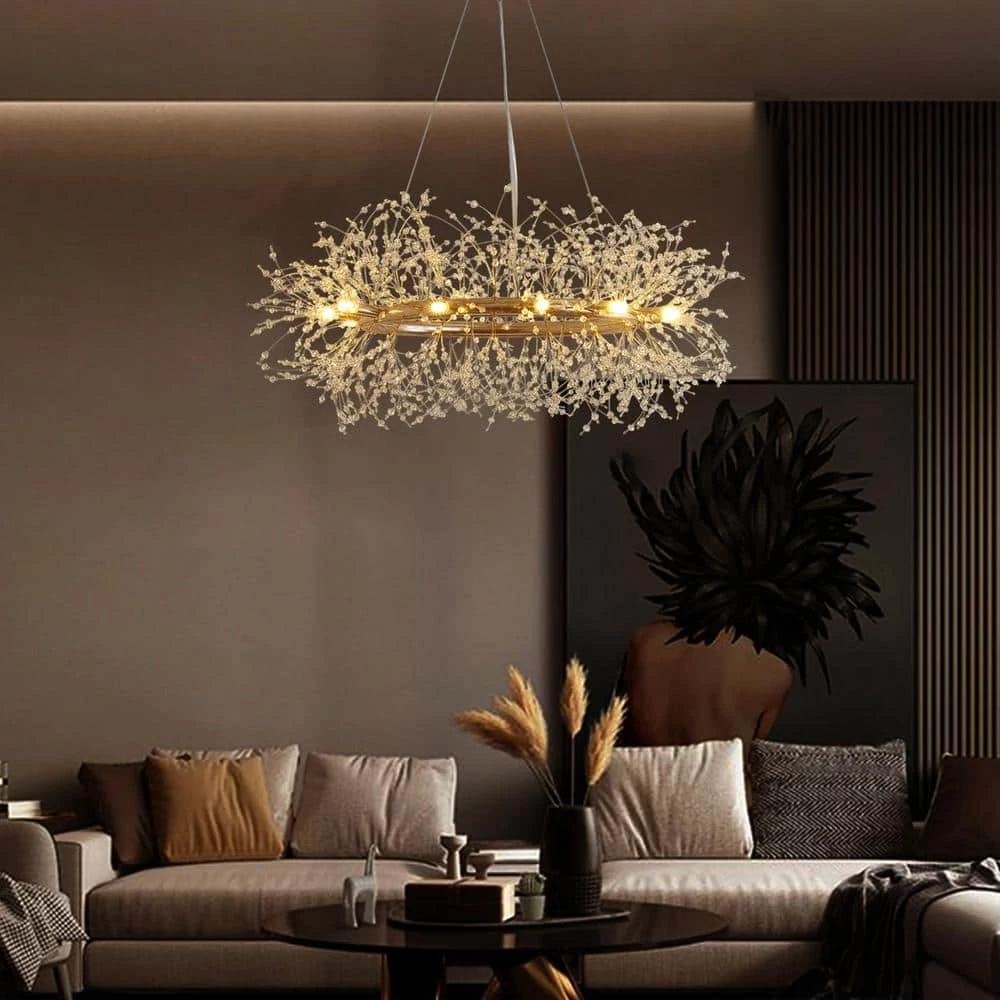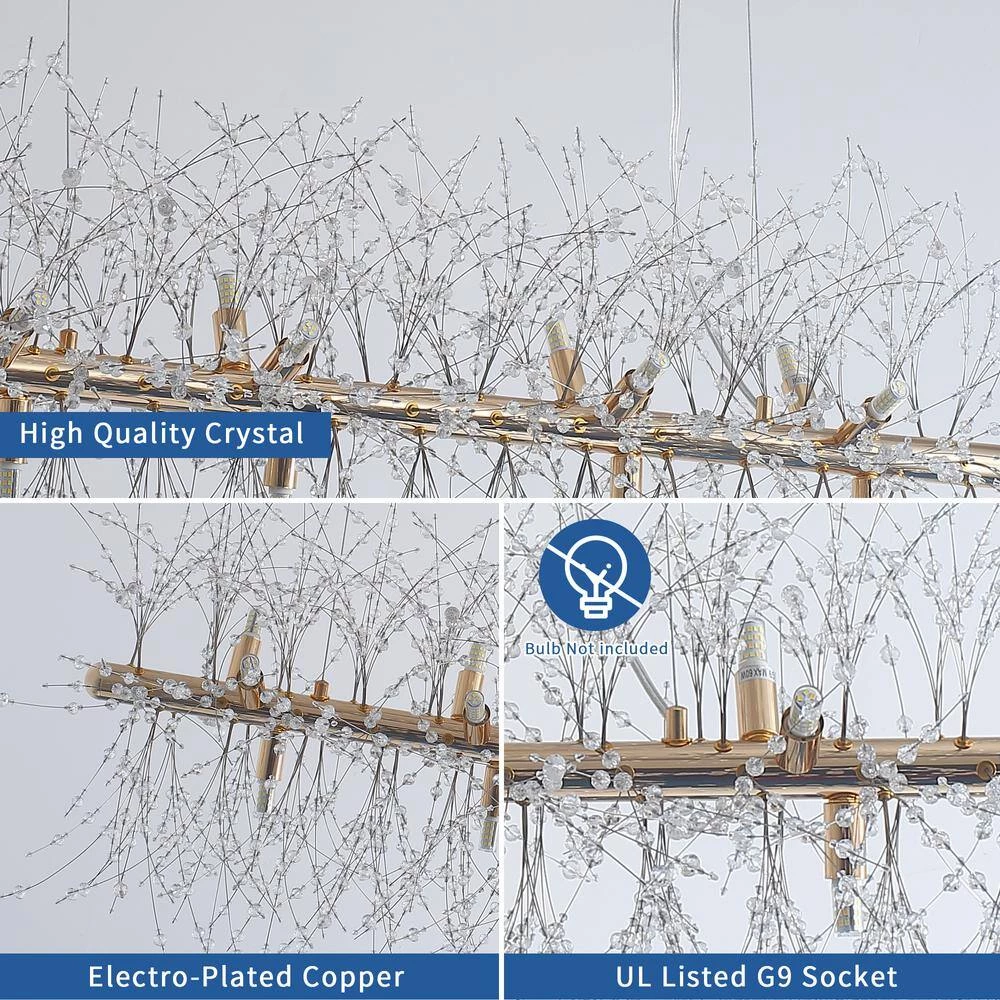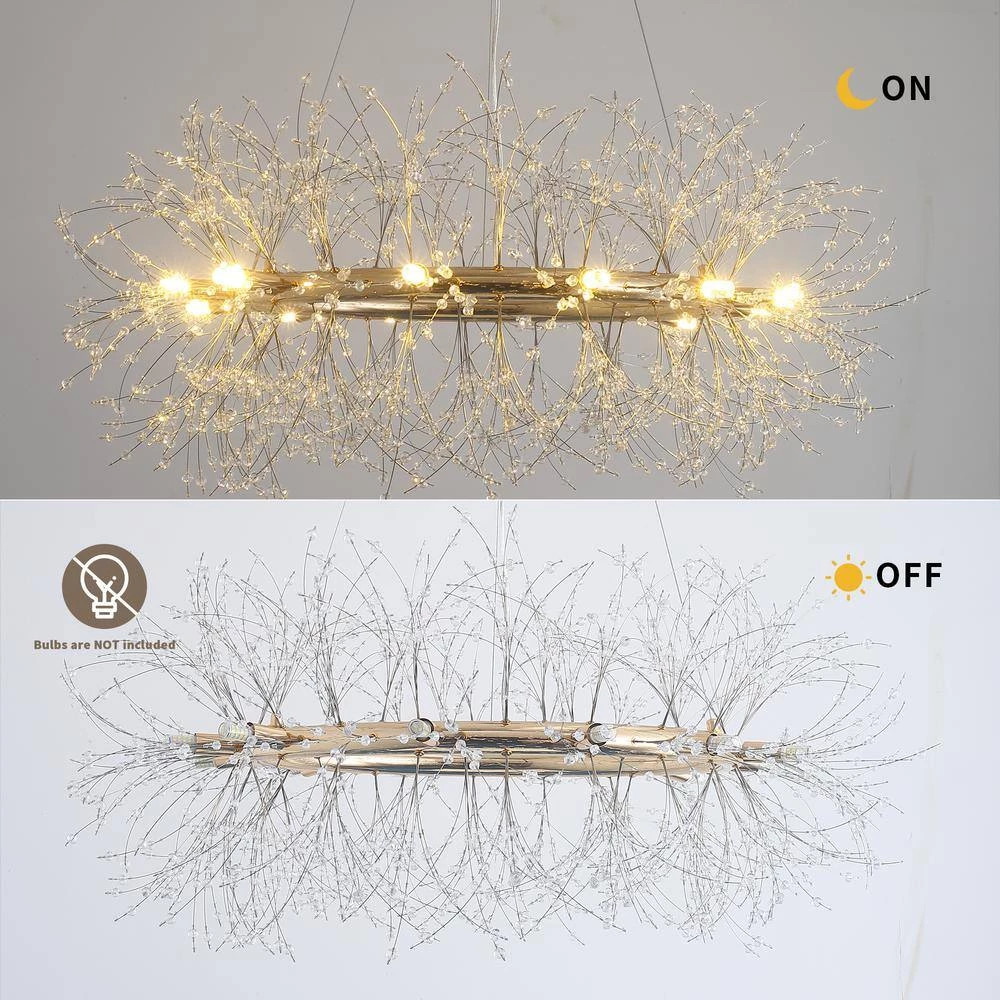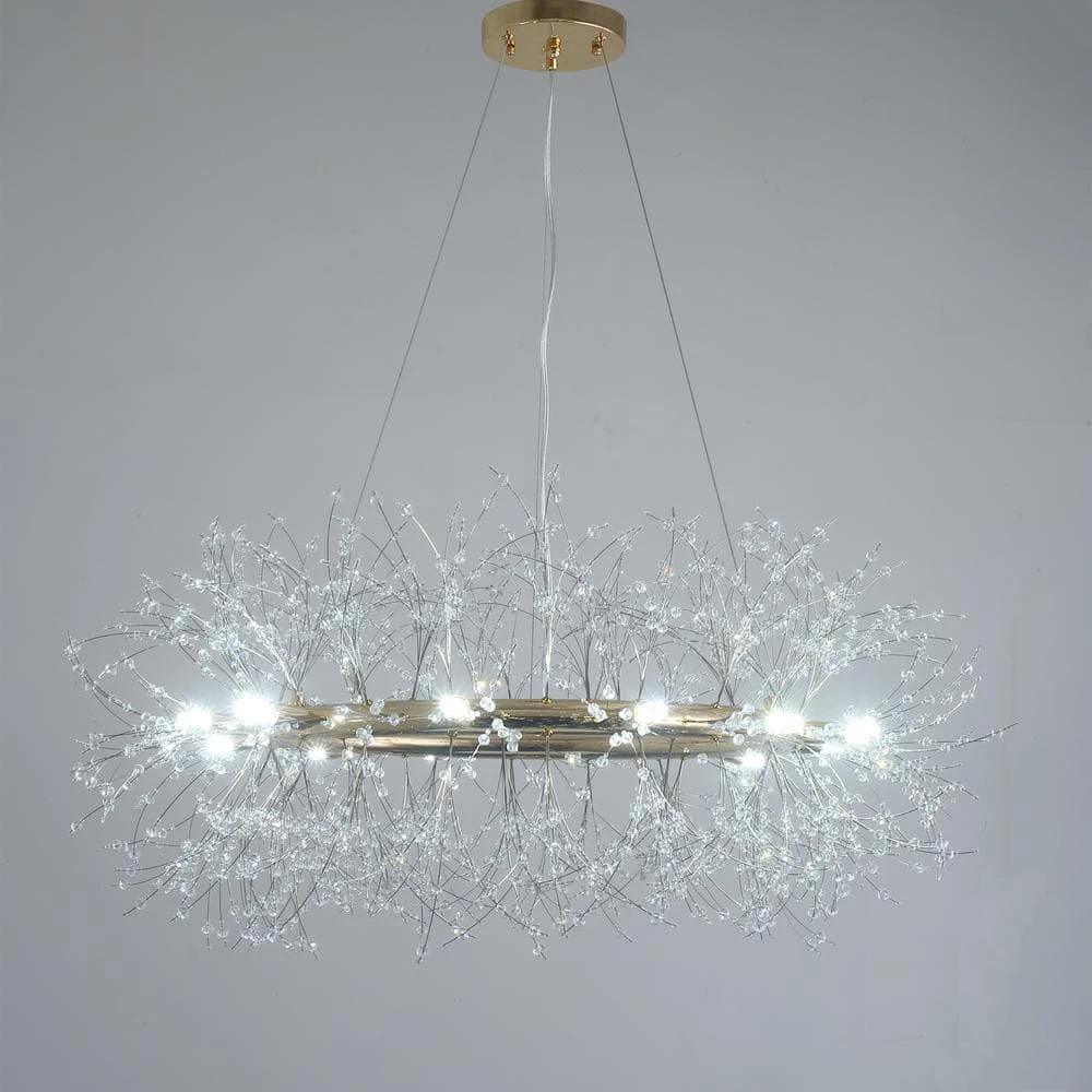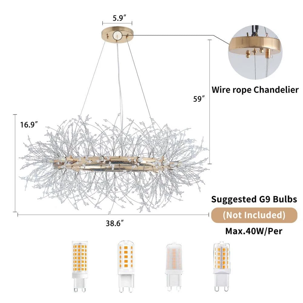 Modern sputnik chandelier with stainless steel lines and crystal strings extending from a wagon wheel in every direction, bloom like fireworks. Larger than regular fireworks chandeliers. Clear Crystals are gorgeous and look like it is a more expensive fixture and true to the picture. It’s the perfect pendant light fixture to install in the kitchen island, dining room, lobby, restaurant, bedroom and any space you like.
