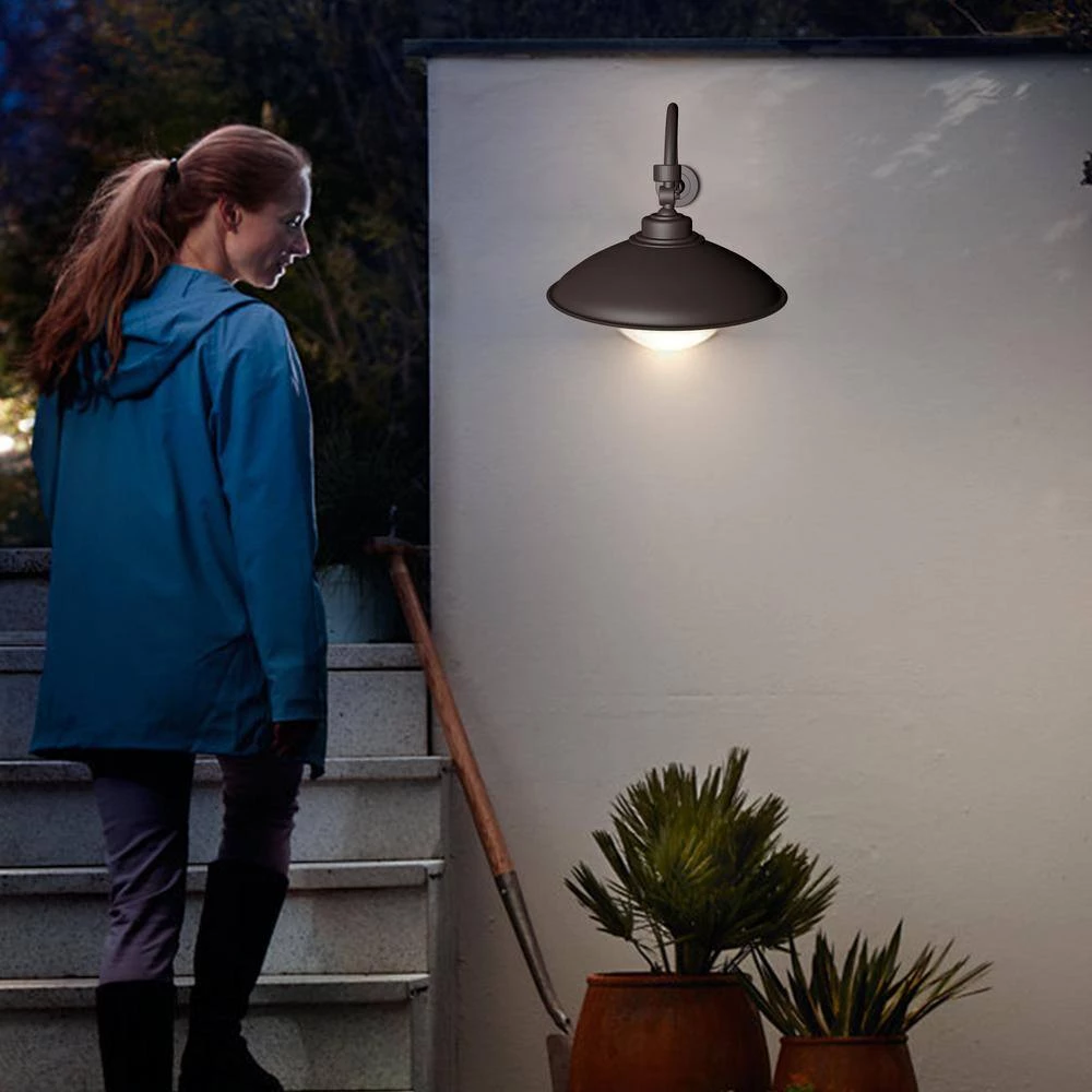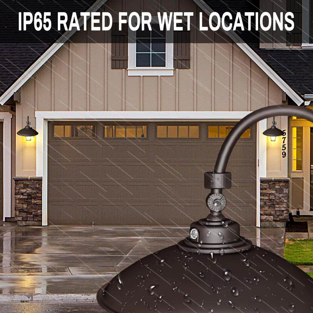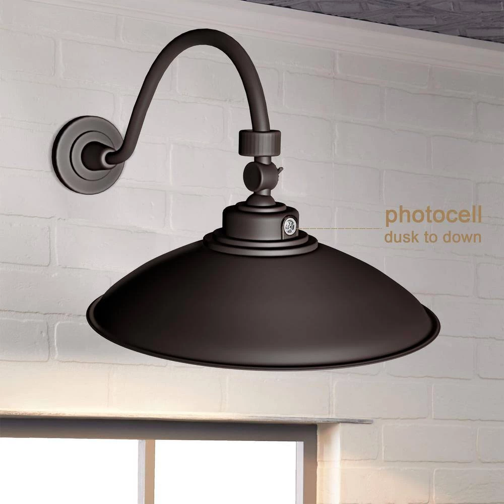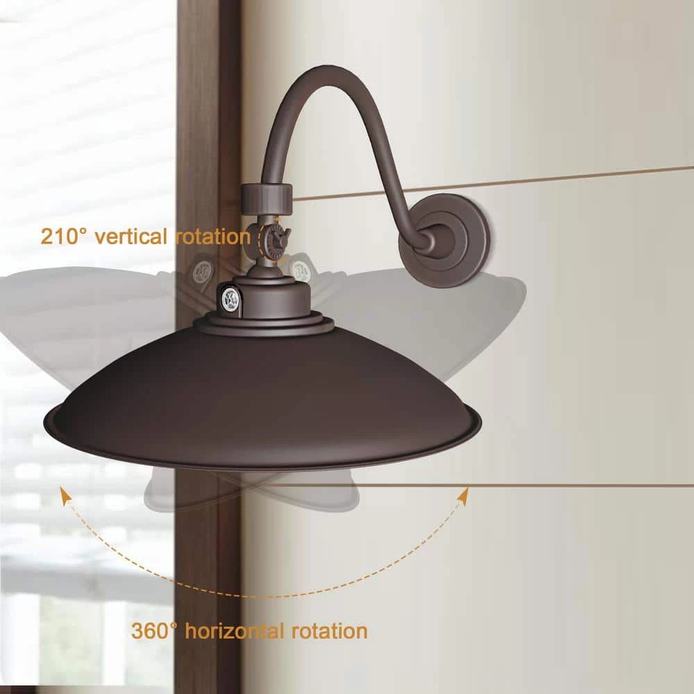 Spitzer 3800 Lumens Outdoor Gooseneck Barn light. It has a brown finish. Also it has a Dusk to Dawn Photocell that turns light on at dust and off at dawn. Lastly, 14-in traditional rustic look with efficient LED lighting, Adjustable up to 210°, and 4000K white color temperature.