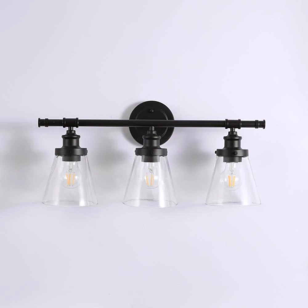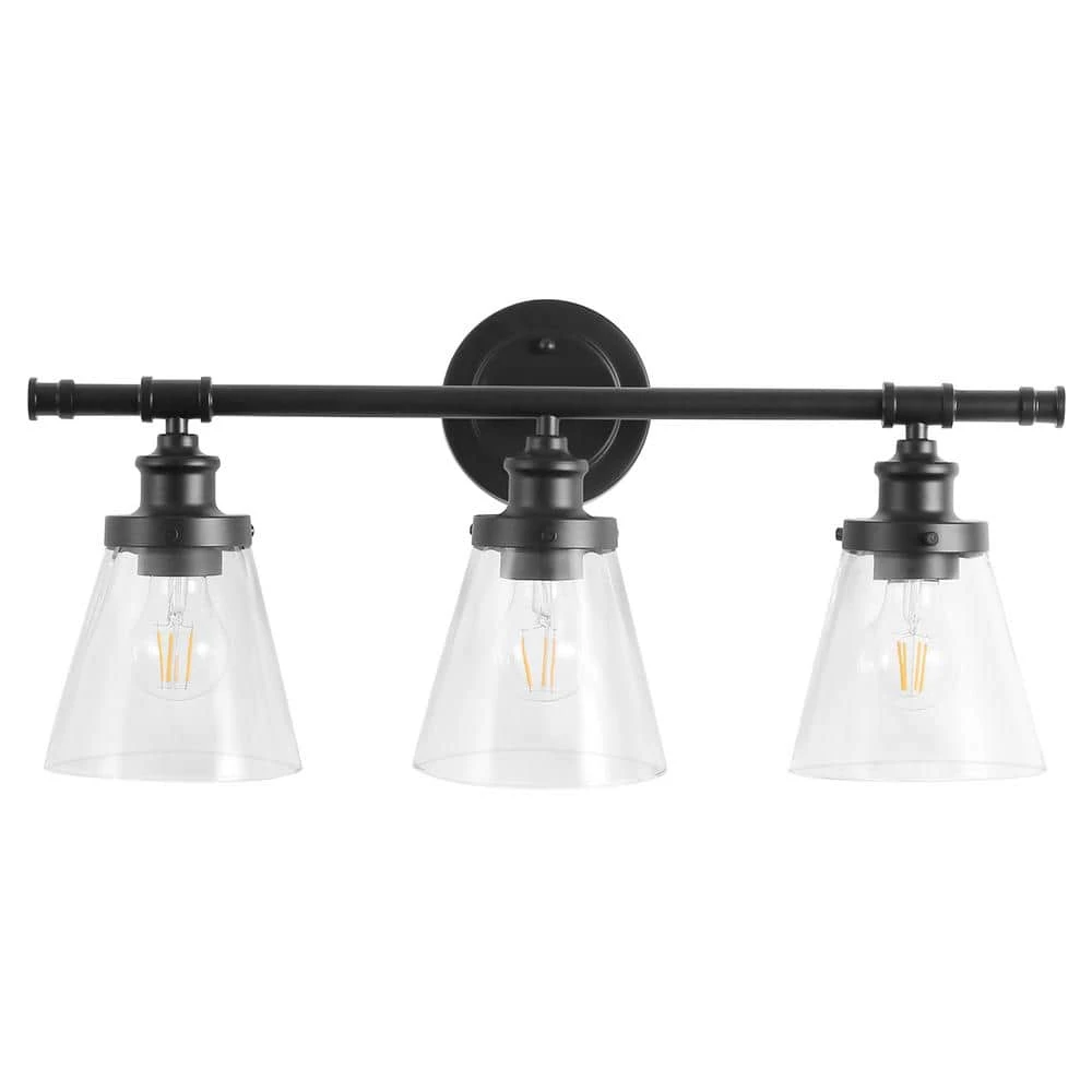 Spitzer’s 3-light Vanity Light is a trendy way to update your bathroom with 1-easy step. with industrial accents and a vintage-inspired shape, these-pieces will complement any space. Complete with a towel bar, towel ring, robe hook, toilet paper holder and 3-light vanity fixture in black with seeded glass shades, your bathroom will look streamline and welcoming.