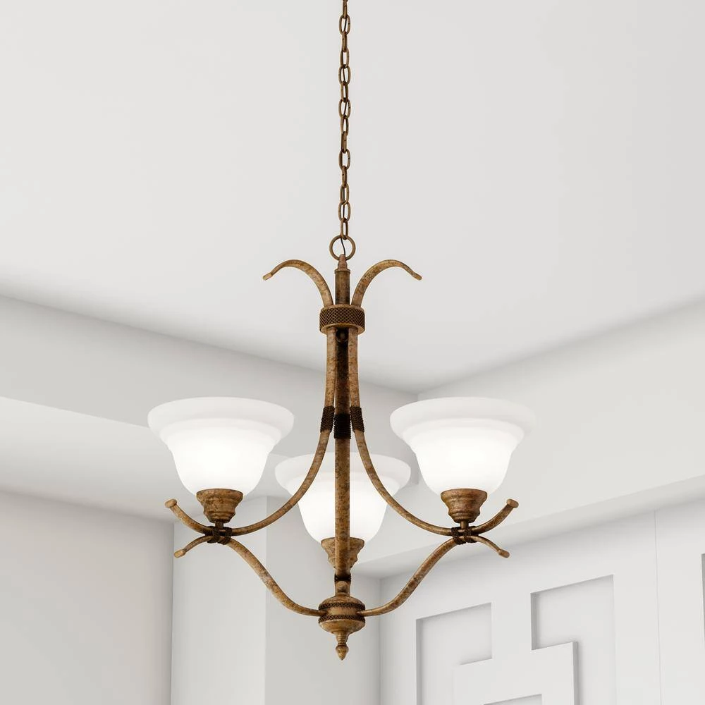 Brighten your breakfast nook or a small dining room with this 3-light chandelier. Gracefully curved arms are wrapped in rope, and it features a hand applied twilight gold finish and faux alabaster shades. The durable steel construction ensures that this chandelier will continue to perform well and look great for years to come.