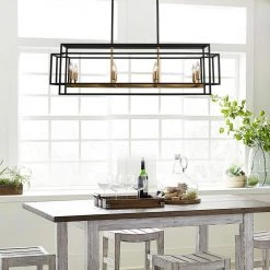 This classic 4-Light pendant light features a metal caged frame of negative space with exposed bulbs that illuminate from within the center. The shape of the fixture is inspired by iconic street oil lanterns. The pendant light suspends from a chain link that is adjustable to allow the fixture to hang in different height from your ceiling.