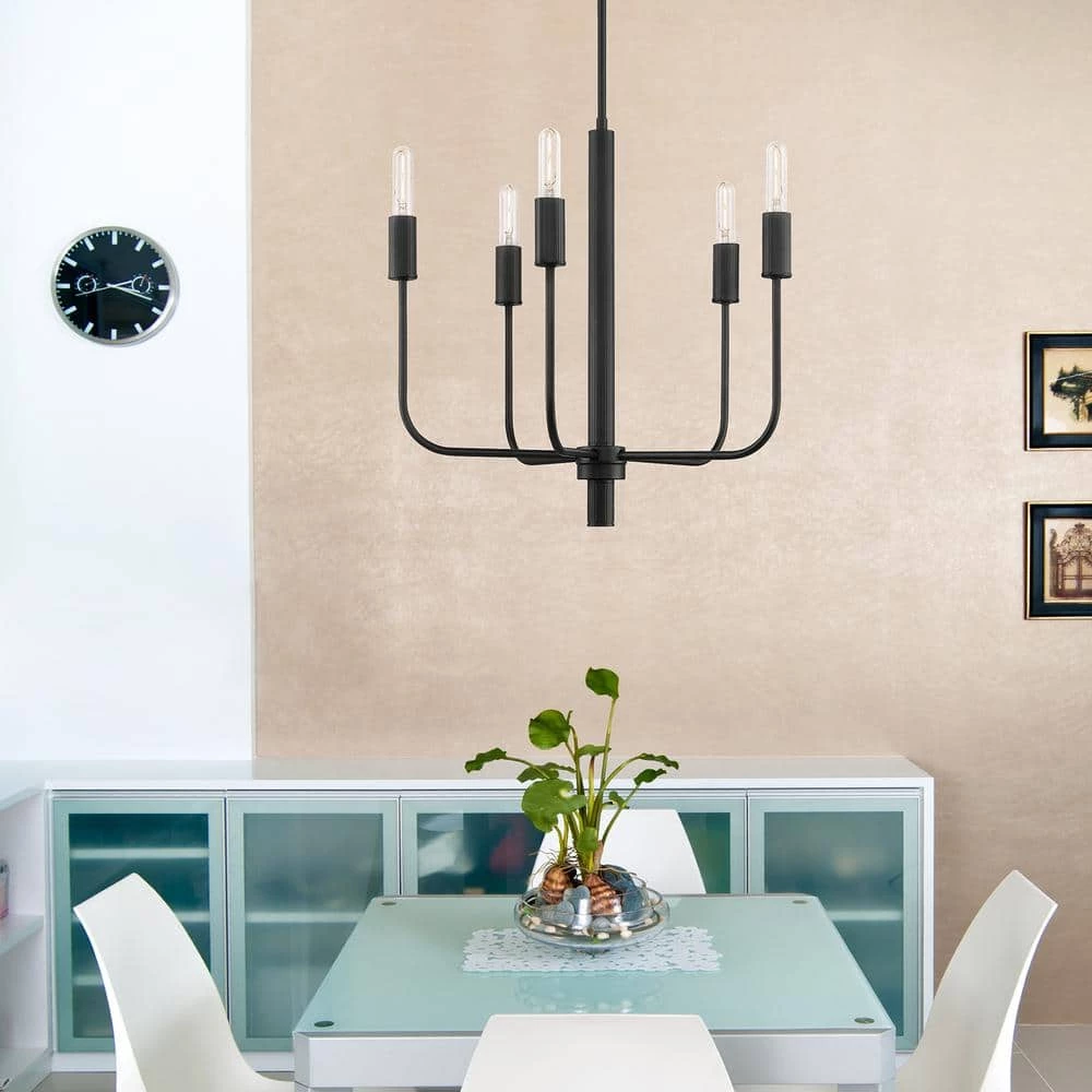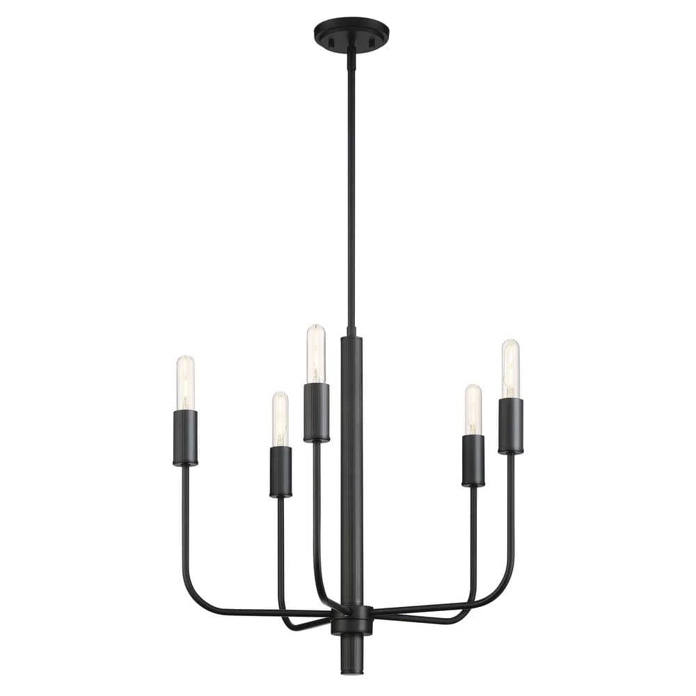 Designed to highlight the ribbed column and socket cover detail, this 5-light chandelier speaks to the current modern trend of bare lamps and clean design. The rich Matte Black finish further captures today’s most wanted look, while the curve of the arm brings a layer of softness. Customizable simply through the bulb choice, this fixture offers endless styles and will maintain its Classic appeal.