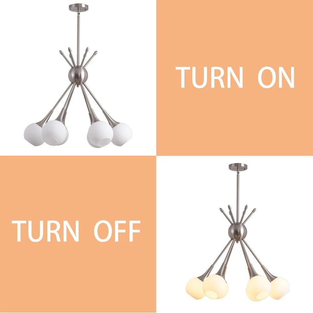 This Brushed Nickel chandelier semi flush mount ceiling lighting fixture is suited for Any Space. Design with simple yet classic shapes and exposed socket creates a mid century modern look, it will add a perfect touch to your furnishing and balance the elements around it. Believing it will be a great choice for your home decor.