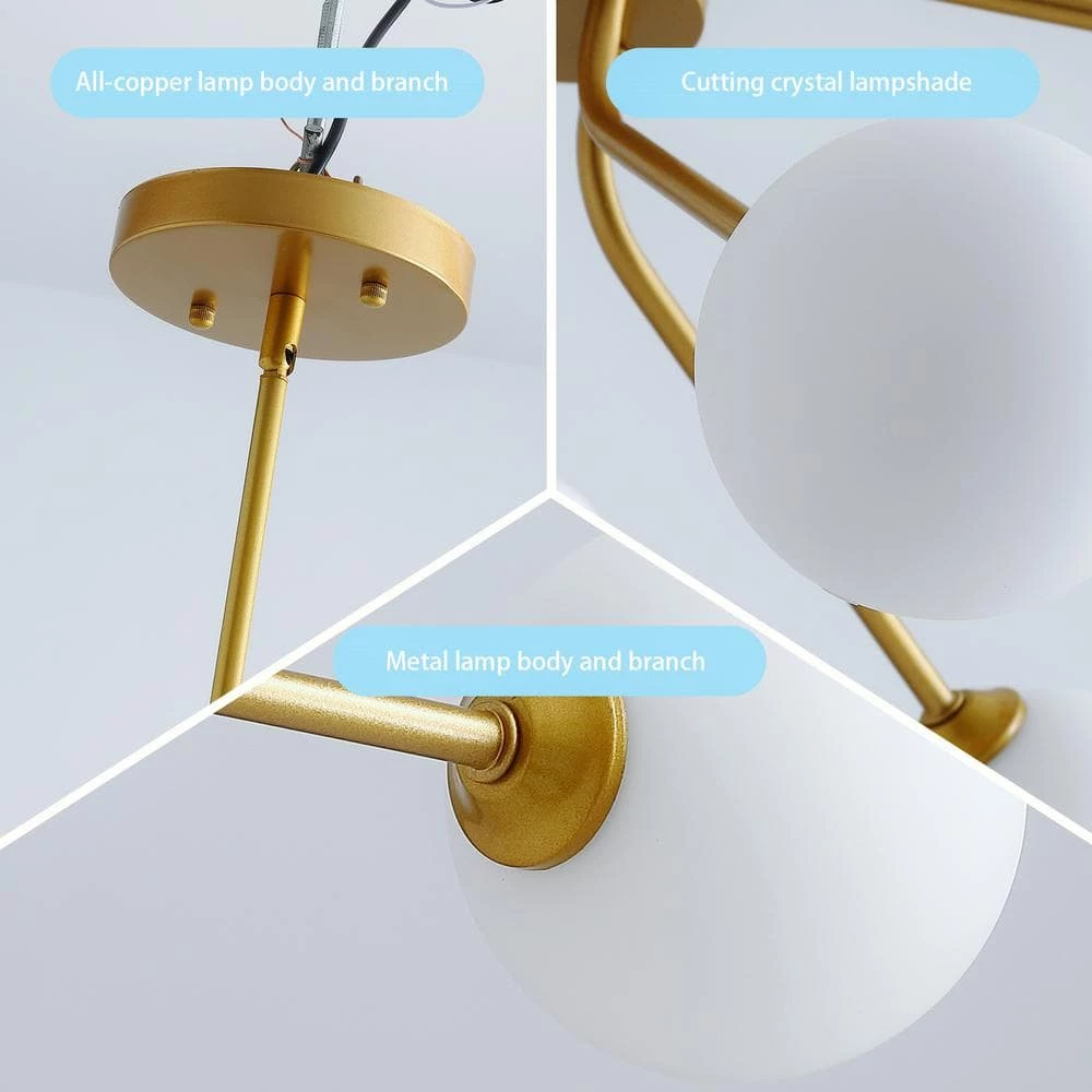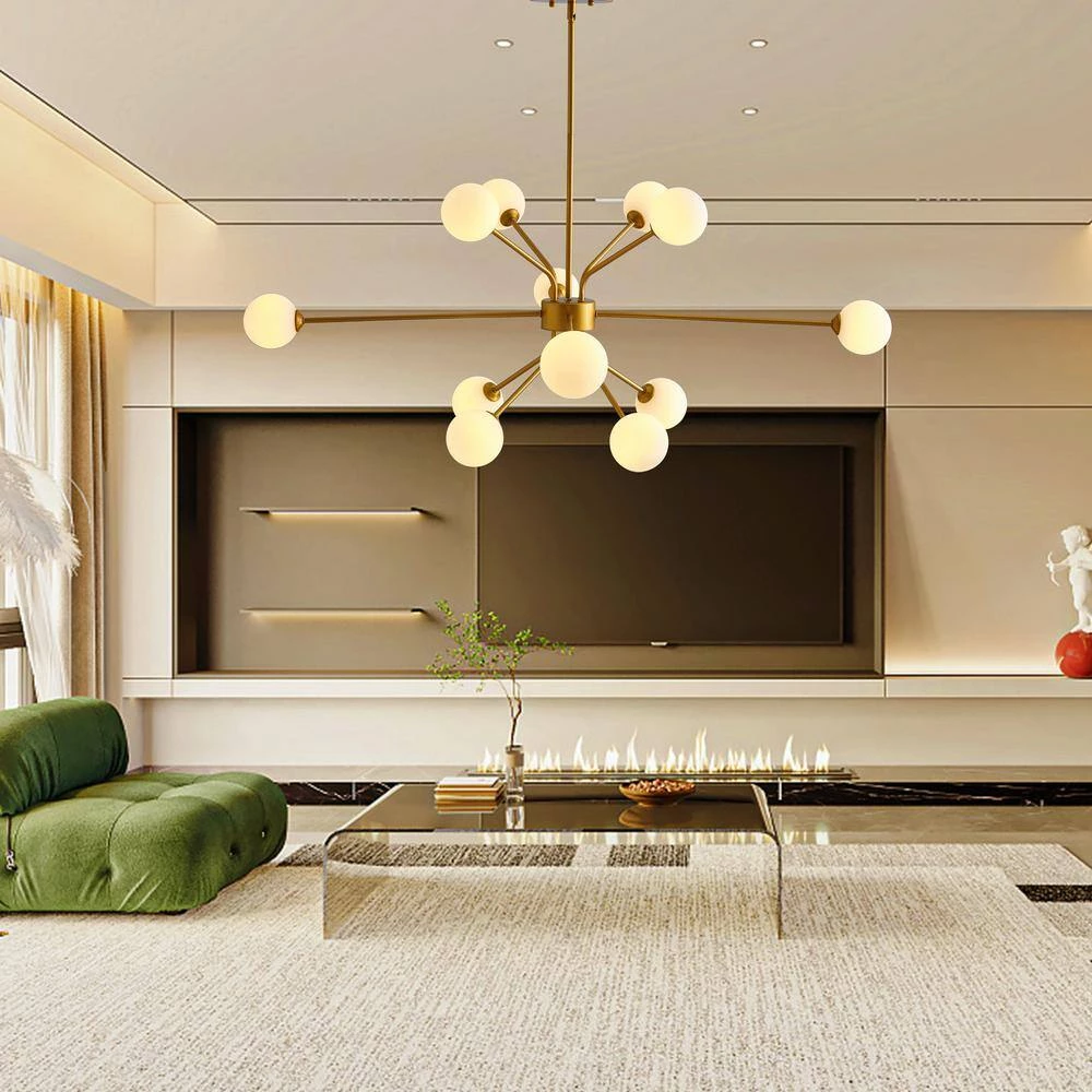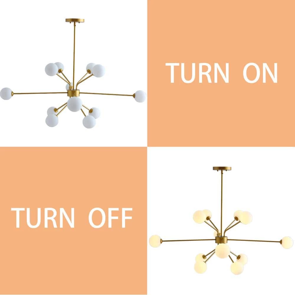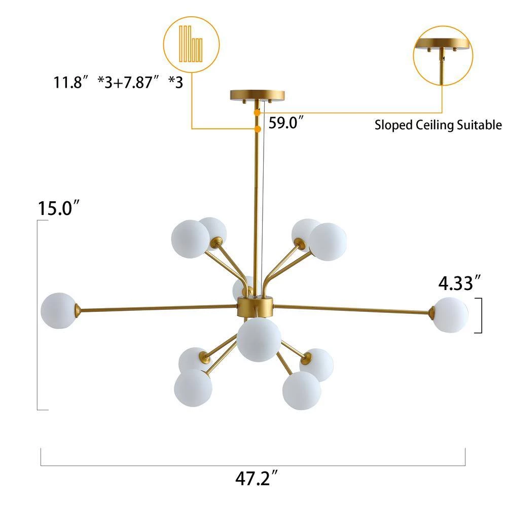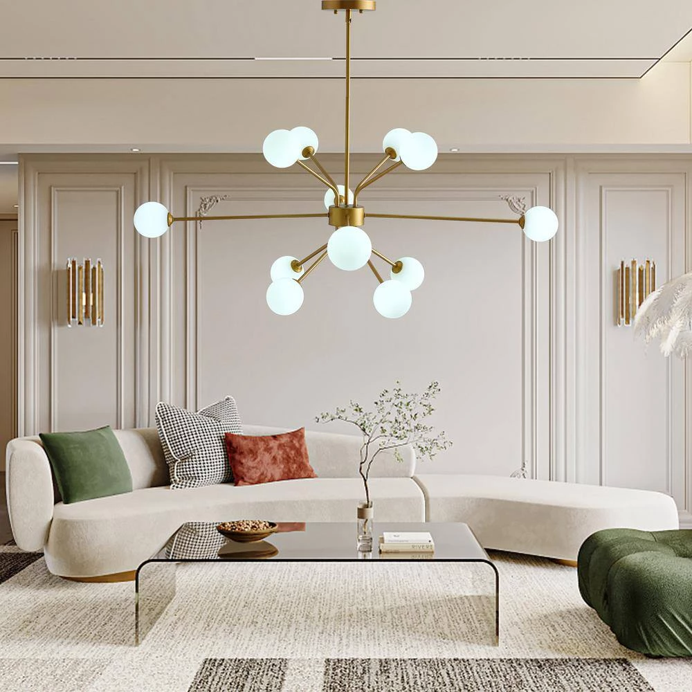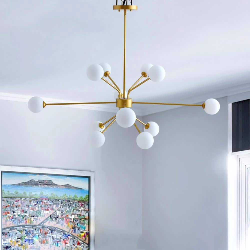 Defined by its distinctive sputnik design, this 12-light globe-shade chandelier brings a splash of mid-century style as it illuminates any room. With the combination of golden finishes and white globes, your guests will be attracted by it at first sight. Come and decor your home.
