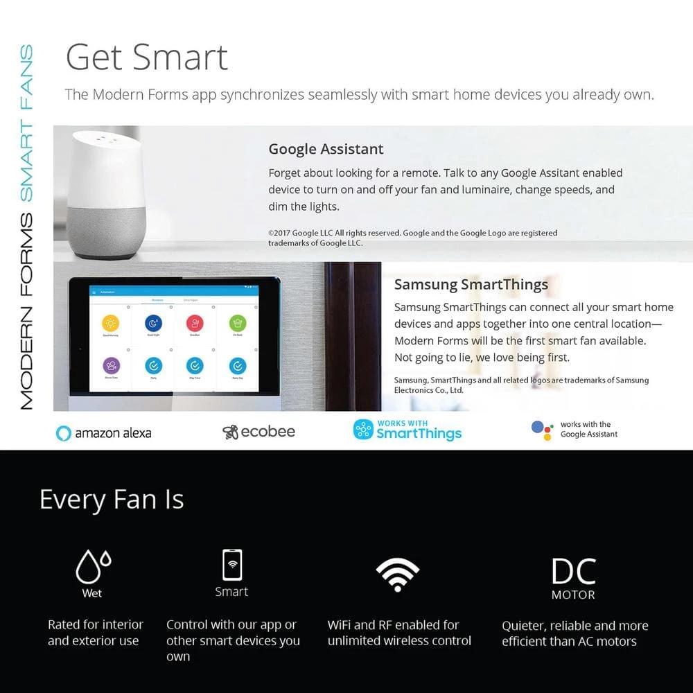 - Modern Forms Fans pair with the smart home tech you know and love, including Google Assistant, Alexa, Samsung Smart Things, Ecobee, Control4, and Josh AI. Coming Soon: Savant, Lutron Homeworks, and Nest.