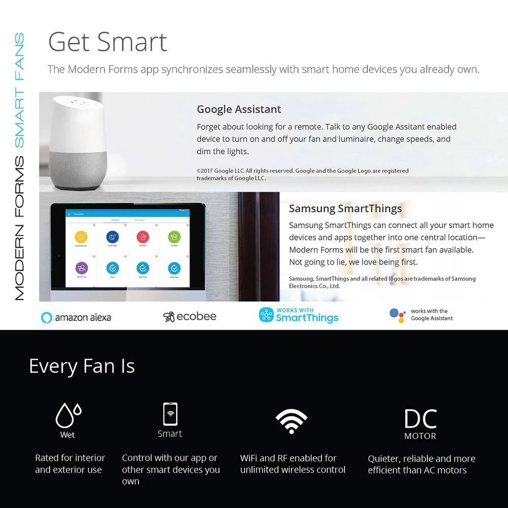 - Modern Forms Fans pair with the smart home tech you know and love, including Google Assistant, Amazon Alexa, Samsung Smart Things, Ecobee, Control4, and Josh AI. Coming Soon: Savant, Lutron Homeworks, and Nest.